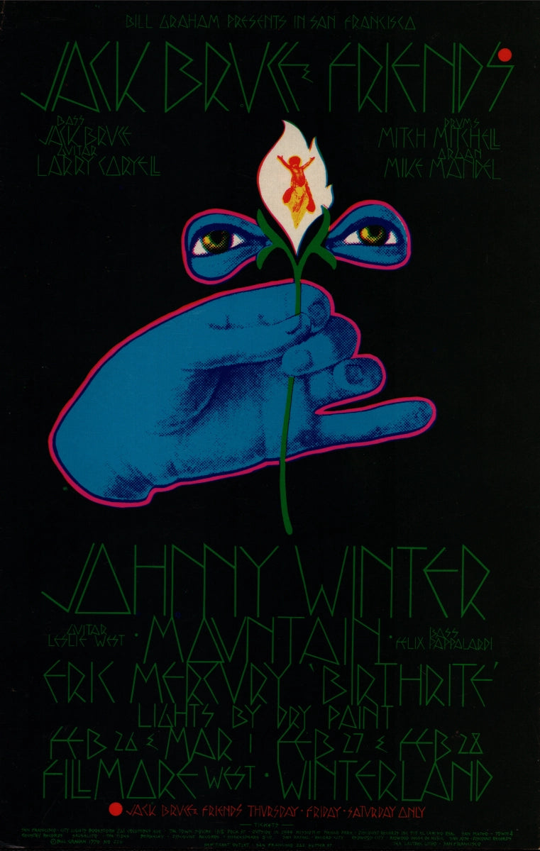 For the second time in a Graham poster, Singer abandoned his signature picture-frame style to make a cool blue announcement for Johnny Winter. With this concert, former Cream bass player Jack Bruce returned to San Francisco with some friends including former Jimi Hendrix Experience drummer Mitch Mitchell and jazz-rock pioneer, Larry Coryell.