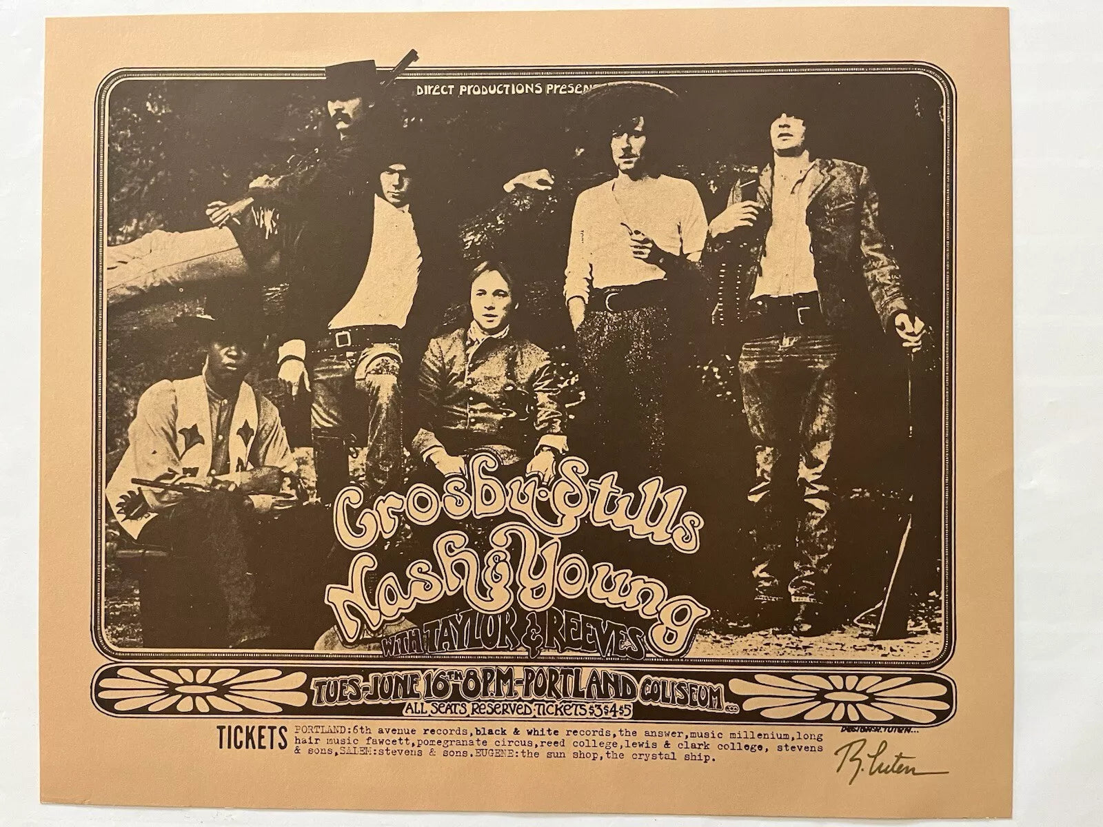 This attractive poster was designed by Randy Tuten for a 1970 show at the Portland Coliseum featuring Crosby, Stills, Nash & Young with Taylor and Reeves.