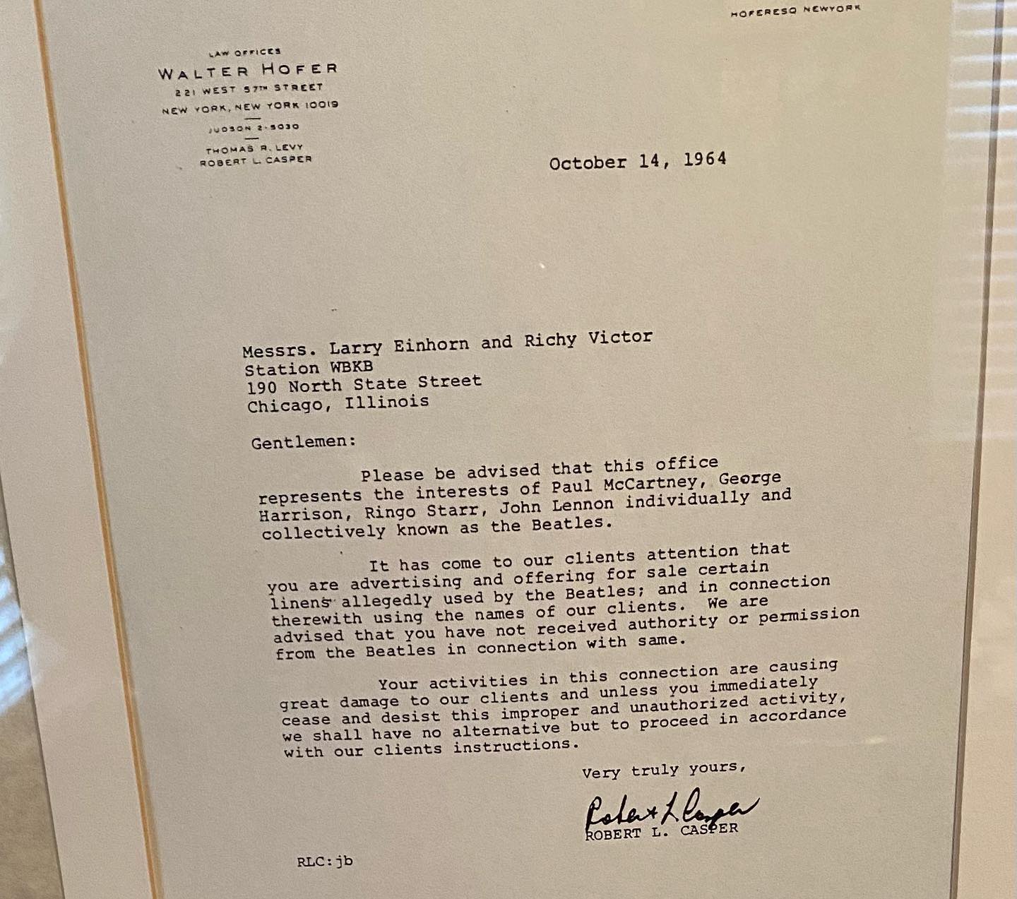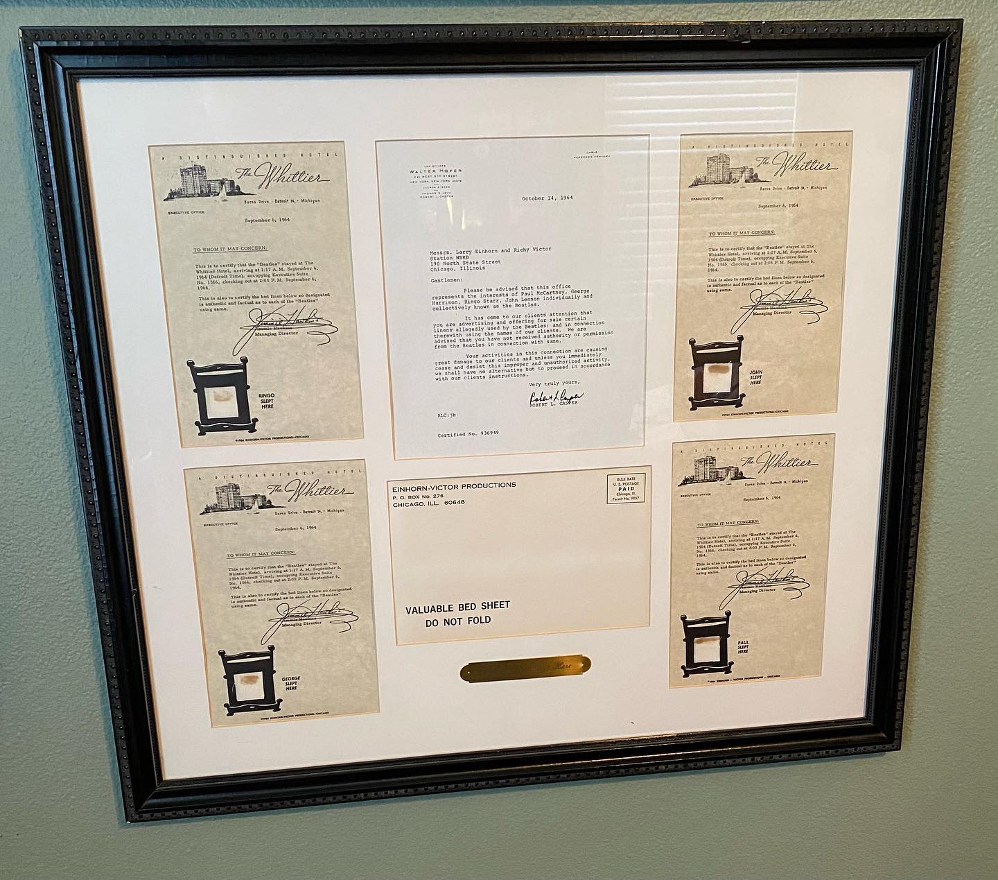 Framed display of Letters with bed sheet swatches and a letter from the Beatles attorney telling them to cease and desist.