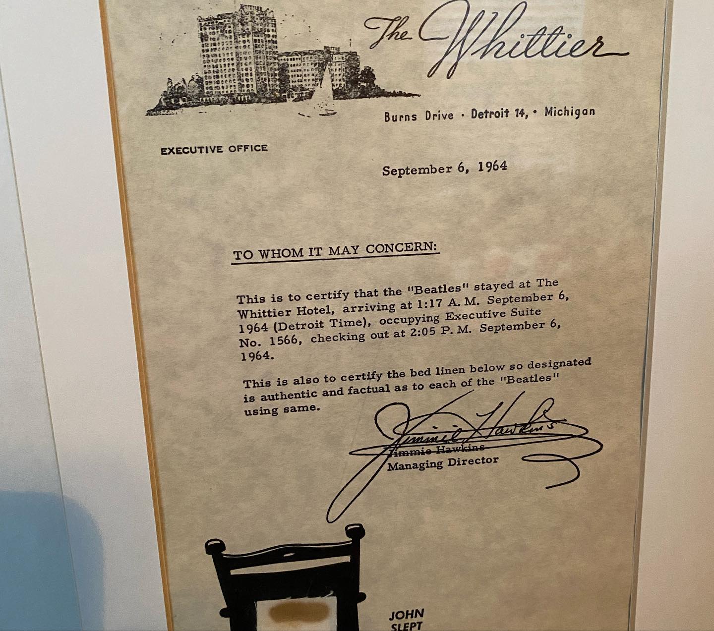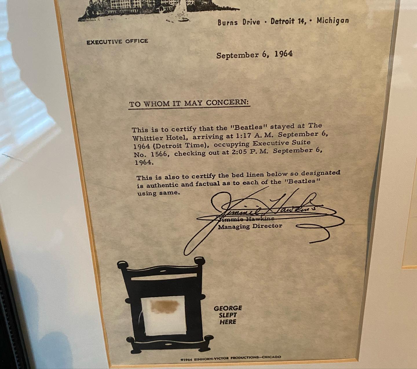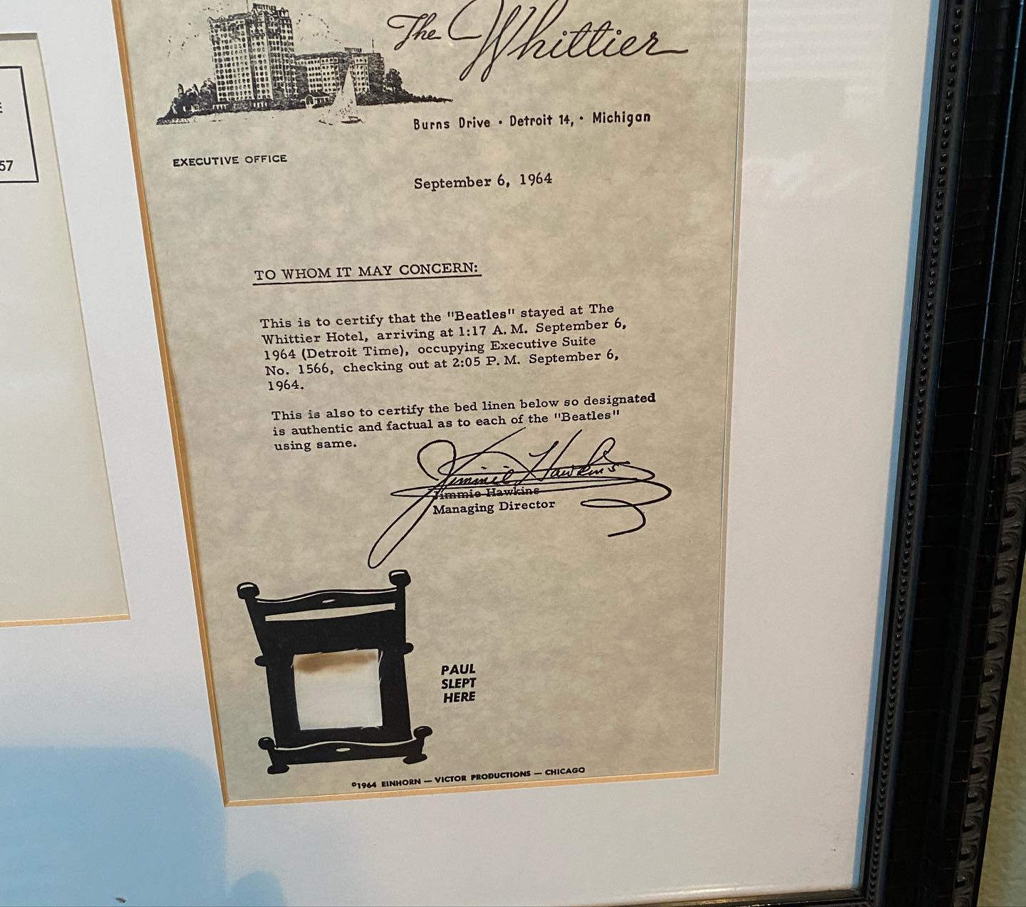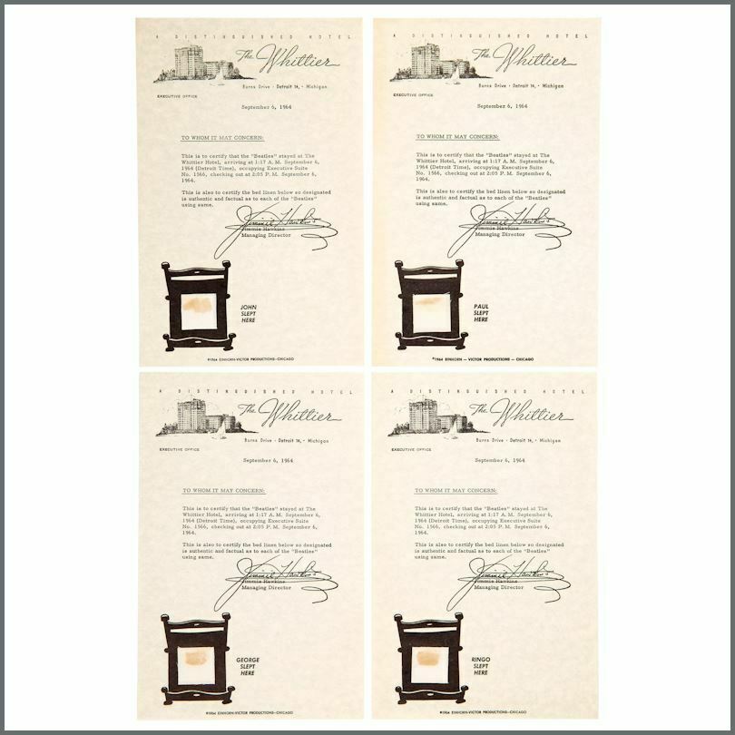 The Beatles stayed at the Whittier Hotel, Detroit, Michigan on the 6th September 1964 while the group were in the city to perform two shows at the Olympia Stadium. Each swatch is glued to a letter which confirms that the group stayed at the hotel, when they checked in and out. In the bottom left corner an approximately 1 inch square of bedsheet has been glued to the letter. Each letter measures 14.8cm x 22.8cm (5.8 inches x 9 inches). There is a glue stain to the upper part of each bedsheet. The condition overall is very good plus.
